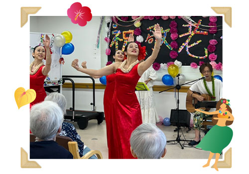 施設にいながらも、音楽やダンスを通じて、楽しいひとときをお過ごしいただけるよう、様々なプログラムをご用意しております。